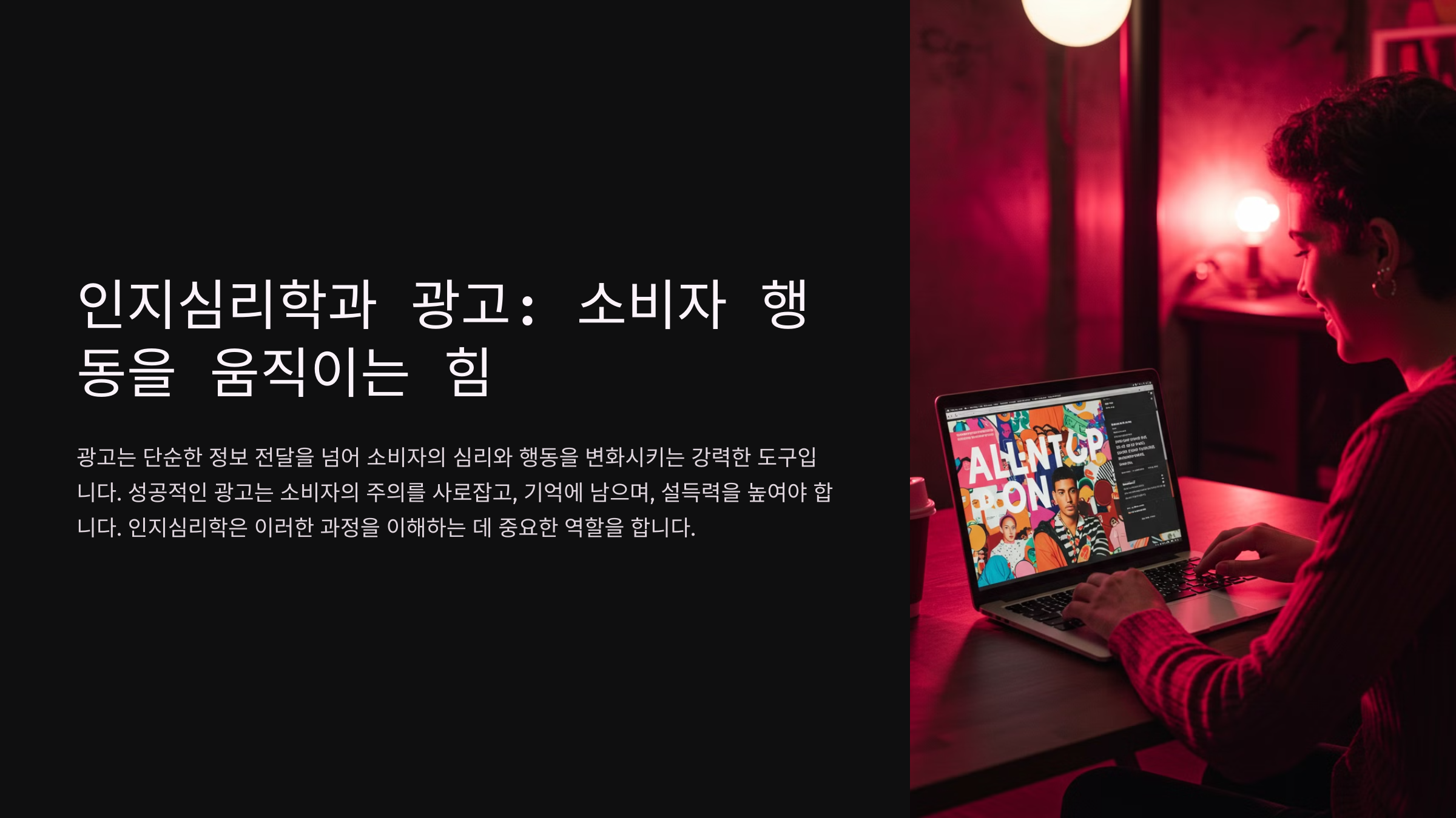 인지심리학은 인간이 정보를 처리하고 기억하며, 의사결정을 내리는 방식을 연구하는 학문입니다. 광고는 이러한 인지 과정을 활용하여 소비자가 제품을 인식하고 구매하도록 유도합니다. 광고가 소비자 행동에 영향을 미치는 주요 요소는 다음과 같습니다: