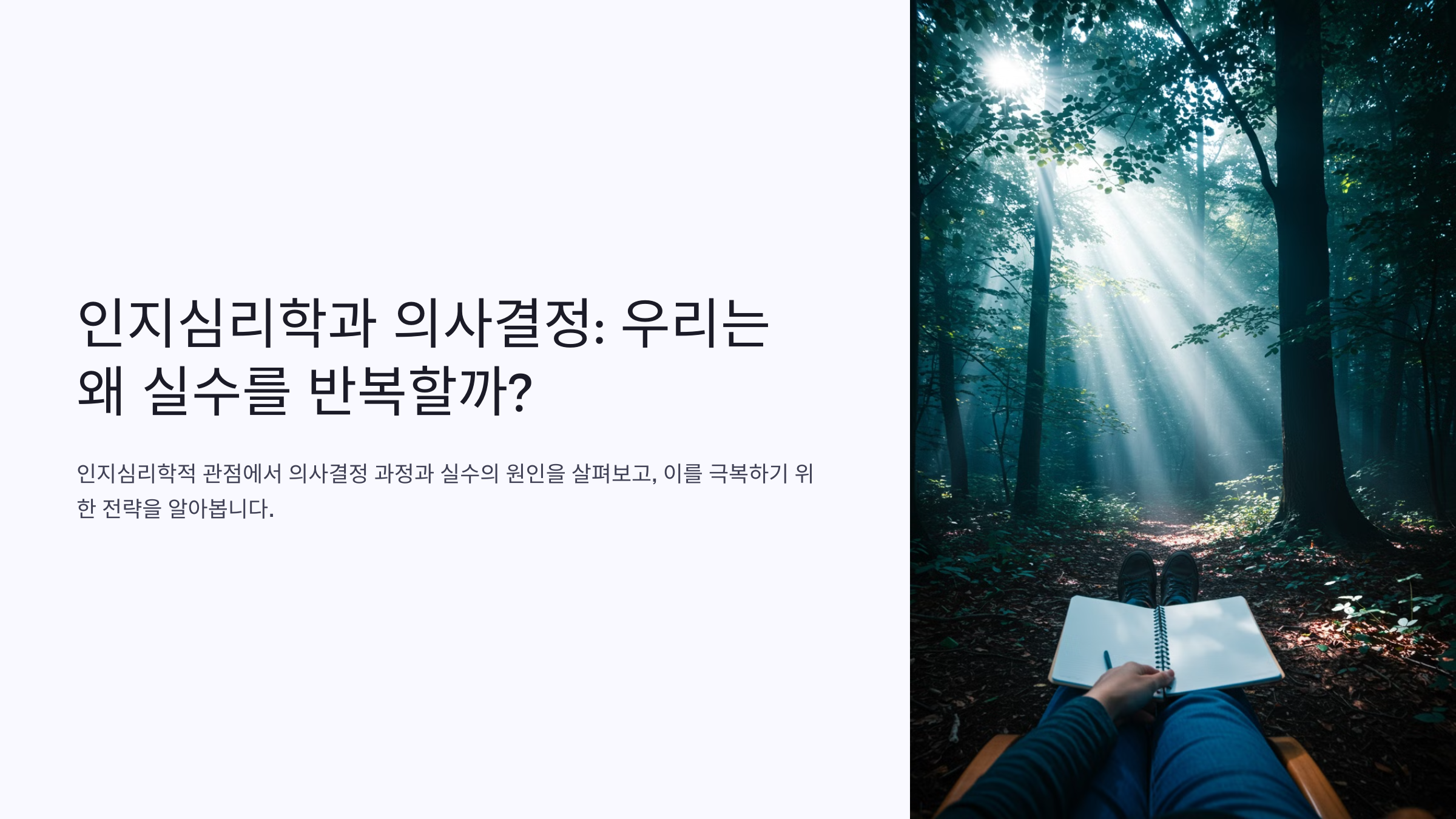 의사결정 과정에서 실수를 반복하는 것은 인간의 자연스러운 한계와 편향 때문입니다. 그러나 인지심리학의 원리를 이해하고 이를 실천에 적용한다면, 실수를 줄이고 더 나은 선택을 할 수 있습니다. 중요한 것은 실수를 통해 배우고 개선하는 자세입니다.