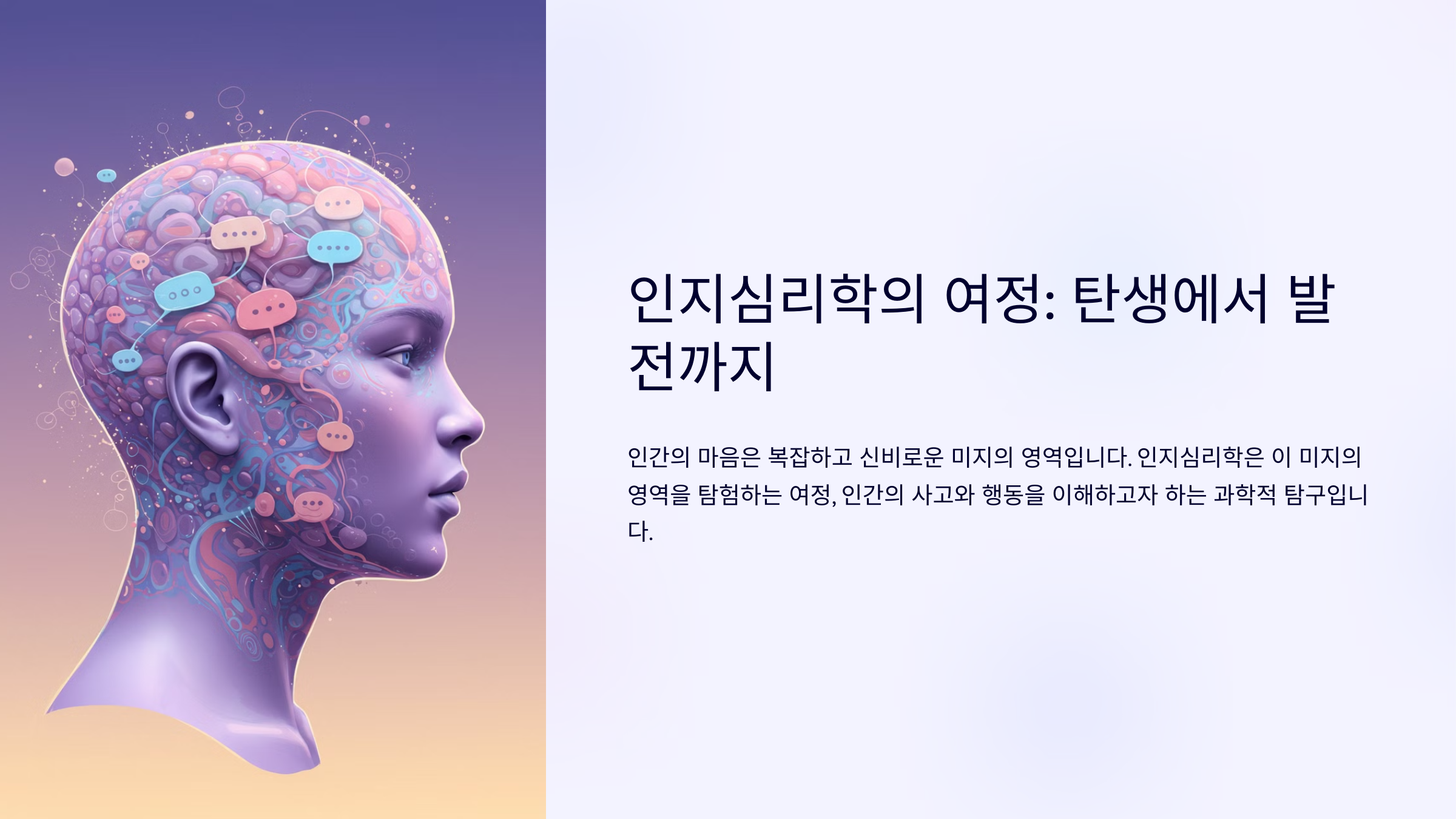 인지심리학은 사고, 기억, 학습, 문제 해결 등 인간의 내면적 과정을 과학적으로 연구하는 심리학의 한 분야입니다. 이 학문은 행동주의가 설명하지 못한 인간 행동의 복잡성을 다루며, 교육, 기술, 심리치료 등 실생활에서 큰 영향을 미치는 학문으로 발전해왔습니다.